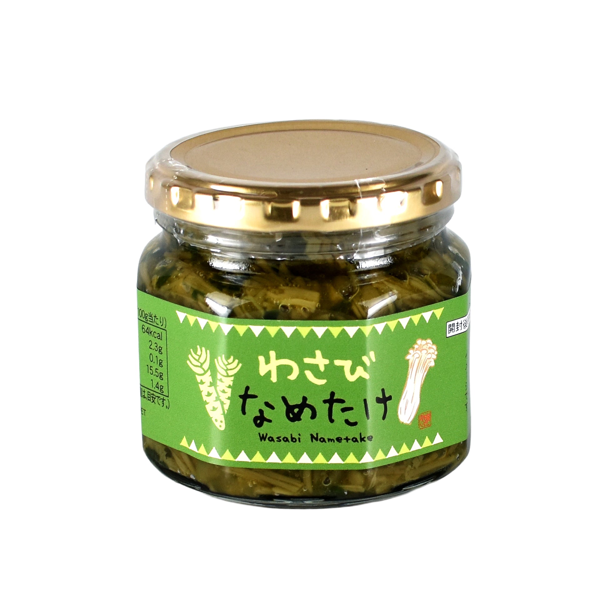 | 原材料名 | えのき(信州産)、わさび茎、野沢菜、しょうゆ、醸造調味料、砂糖、風味調味料、香辛料、寒天/ソルビット、調味料(アミノ酸等)、酸味料、増粘剤(増粘多糖類、加工でん粉)、環状オリゴ糖、リン酸塩(Na)、香料、香辛料抽出物、着色料(黄4、青1)、セルロース、酸化防止剤(V.C)、(一部小麦・大豆を含む) |